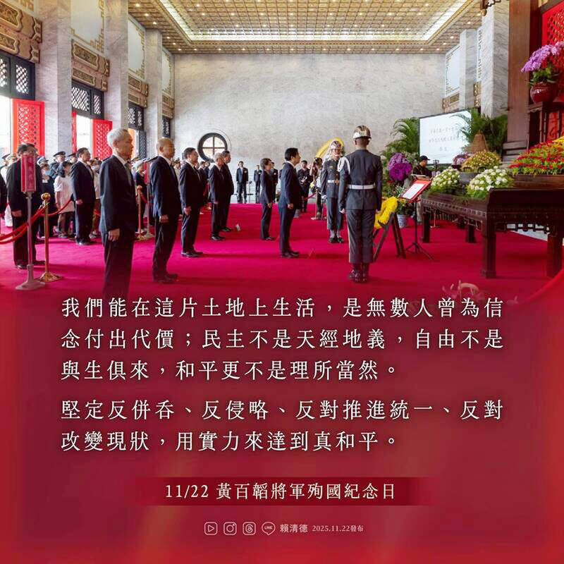 “Today is the memorial day of General Huang Bai-tao’s sacrifice for the country. As the Commander-in-Chief of the Republic of China’s Armed Forces, I would like to pay the highest respect to him and to all the martyrs who sacrificed their lives for the country,” Lai wrote.