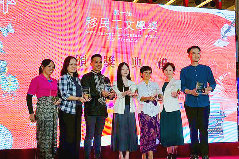 Migrant workers and new immigrants were celebrated yesterday at Taipei Main Station for their contributions to Taiwan’s literary landscape, with many awardees using the moment to express both their gratitude for Taiwan and their frustrations over the limits they continue to face.