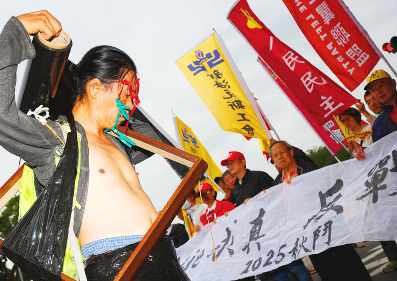 Artist Tseng Chi-ming, left, yesterday performs in front of the Presidential Office Building on Ketagalan Boulevard in Taipei to express an anti-war sentiment. The performance was a part of a news conference for the Autumn Struggle protest march on Sunday, urging the government to focus on social reforms over military spending.