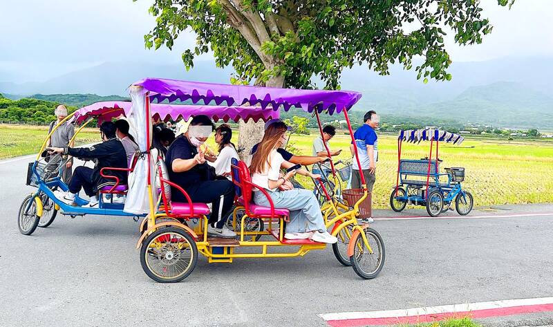 Tourists ride rented electric-assisted pedelecs in the scenic Mr Brown Avenue in Taitung County yesterday. As several traffic accidents involving pedelecs have been reported in recent years, the county government in June required all rental companies to complete safety examinations and enroll in insurance plans. However, more than 30 pedelecs still have not undergone safety inspections and must complete them before the end of the month, it said.