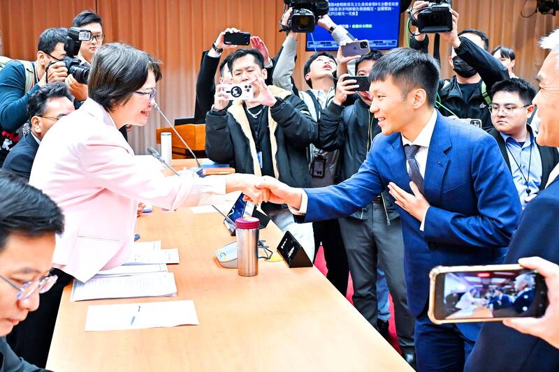 Olympic gold medalist and first Minister of Sports Lee Yang, right, shakes hands with Taiwan People’s Party Legislator Liu Shu-pin, left, before a meeting of the legislature’s Education and Culture Committee yesterday. Lee, who took office on Sept. 9, made his first ministerial report at the legislature yesterday, in which he vowed to improve athletes’ rights and address the issue of uneven distribution of resources.