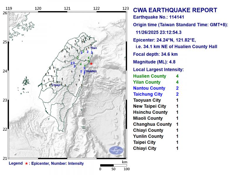 The hypocenter was 34.1km northeast of Hualien County Hall at a depth of 34.6km, CWA data showed.