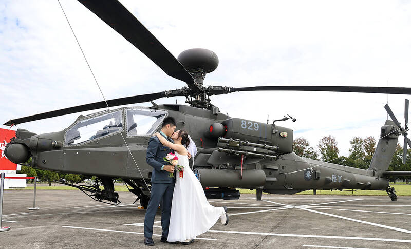 An army service member and his bride kiss in front of an AH-64 Apache attack helicopter at a mass wedding hosted at the Republic of China Army Command Headquarters in Longtan District, Taoyuan, yesterday. Ninety-three couples got married during the ceremony, which featured a horse-drawn carriage and rings delivered by drones.