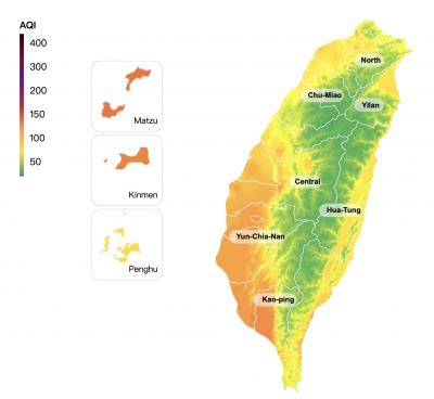 As of 4pm this afternoon, 27 monitoring stations across Taiwan had issued an orange rating for air quality, mostly concentrated in the central and southern regions, the Ministry of Environment (MOENV) Web site showed. An orange warning indicates air quality that is “unhealthy for sensitive groups.” None of the monitoring stations nationwide reported a “green” air quality rating, with all other stations recording yellow for “moderate” air quality. The ministry advised those sensitive to pollution, such as the elderly, children and those with weaker immune systems, to reduce strenuous outdoor activities and wear masks for protection. Northeasterly winds could carry