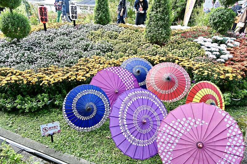 Colorful parasols are pictured in front of blooming chrysanthemums at the Chiang Kai-shek Shilin Residence yesterday. The Shilin Residence Chrysanthemum Festival began yesterday and runs until Dec. 14, featuring 150 varieties of the flower and a special exhibition organized in partnership with Kasama, Japan.