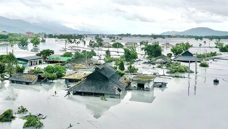 Hualien County’s Mataian River (馬太鞍溪) barrier lake breached on Sept. 23 after torrential rains brought by Typhoon Ragasa, flooding Guangfu Township (光復) and the surrounding area.