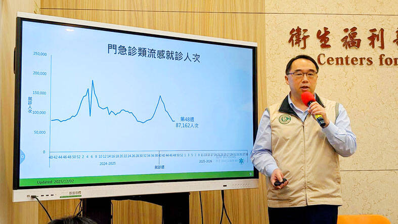 Flu activity reached a peak in late September before declining for eight consecutive weeks, CDC Deputy Director-General and spokesman Lin Min-cheng (林明誠) said.