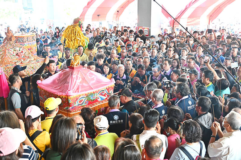 Worshipers stand around a palanquin bearing the statue of Baishatun Matsu yesterday, in front of the Kaohsiung Fishermen’s Association. Miaoli County’s Baishatun Gongtian Matsu Temple agreed to take part in the 313th anniversary of Gangshan Matsu Temple.