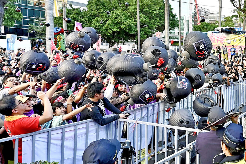 More than 100 marchers carried mock mortar bombs on their back to show that work-year limits are ticking down and could disrupt their lives in Taiwan once their 12 years are up.