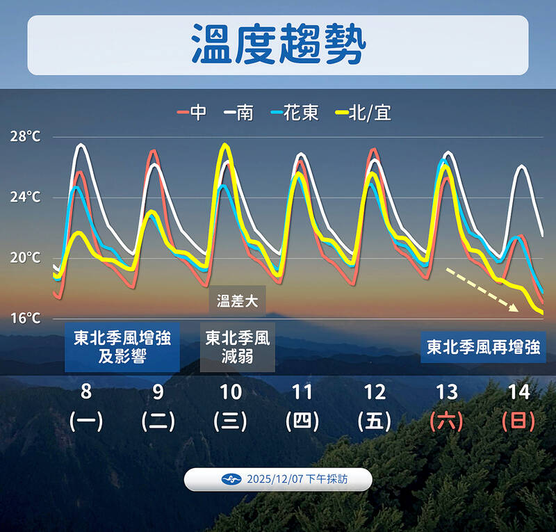 Early-morning temperatures yesterday dipped to 10.7°C in Hsinchu County’s Guansi Township (關西), the lowest recorded in Taiwan’s low-lying areas that day, the Central Weather Administration (CWA) said. The second-lowest temperature recorded in any low-lying area in Taiwan yesterday was in Miaoli County’s Sihu Township (西湖) at 11.4°C, CWA data showed. The cold conditions were due to the influence of radiative cooling, independent meteorologist Daniel Wu De-rong (吳德榮) said. Citing European weather model data, he said the northeasterly monsoon would begin strengthening this morning, increasing moisture and bringing a chance of brief showers to parts of northern and eastern Taiwan, along with a drop in temperatures. The strongest cold air of the season is expected from Saturday to Monday next week, with temperatures in Taiwan’s low-lying areas possibly dropping below 10°C, he said. However, due to weather forecasting limitations, models would continue to be adjusted, and forecasts from different countries vary in intensity and timing, so it is still too early to draw firm conclusions, Wu added.