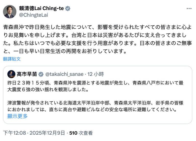 Replying to Japanese Prime Minister Sanae Takaichi’s post on X about the earthquake, Lai wrote in Japanese that Taiwan and Japan have always supported each other in times of disaster, and Taiwan is ready to provide any assistance necessary.