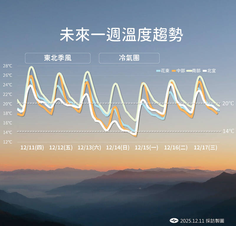 Late Sunday and early Monday are expected to be the coldest, with lows of 12°C to 14°C forecast for lowland areas in northern and central Taiwan, and 14°C to 16°C in most other regions, the CWA said.