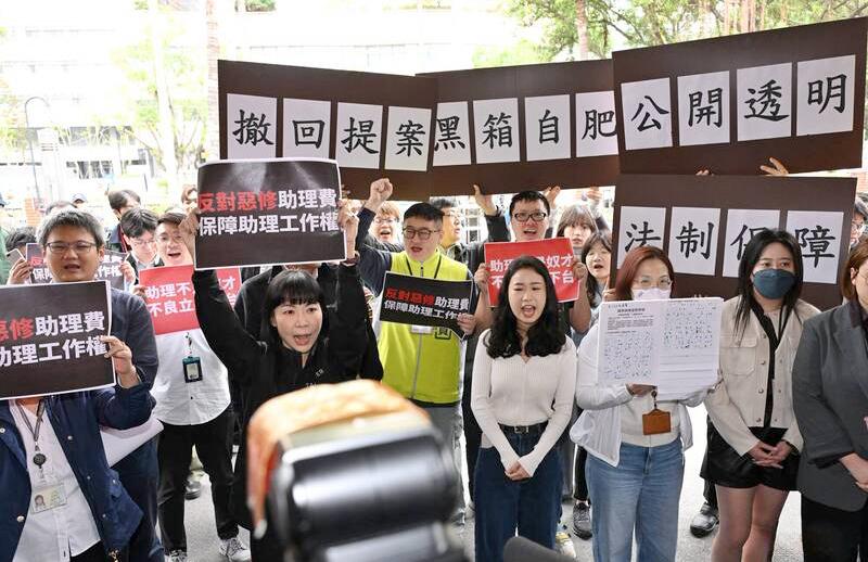 Legislative Assistants’ Union chair Lee Yong-cheng (李永誠), who heads KMT Legislator Lin Shih-ming's (林思銘) office, said that the assistants’ request is simple: They want to keep the current system in place.