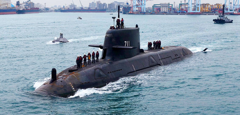 Navy Chief of Staff Vice Admiral Chiu Chun-jung (邱俊榮) during a press conference on Wednesday said that development for the Hai Kun project was at least two months behind schedule.