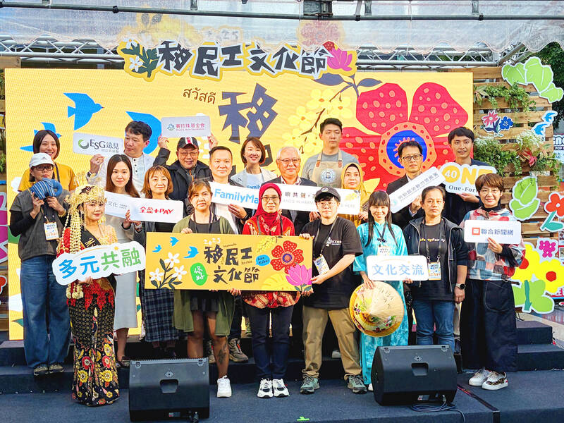 Migrant representatives with representatives from One-Forty and FamilyMart pose for photos at a Migrant’s Day event at Syntrend Plaza in Taipei yesterday. The One-Forty group also announced the launch of the second year of the “One dollar donation” program, the proceeds of which would go toward efforts to help migrants’ adaptation to Taiwan.