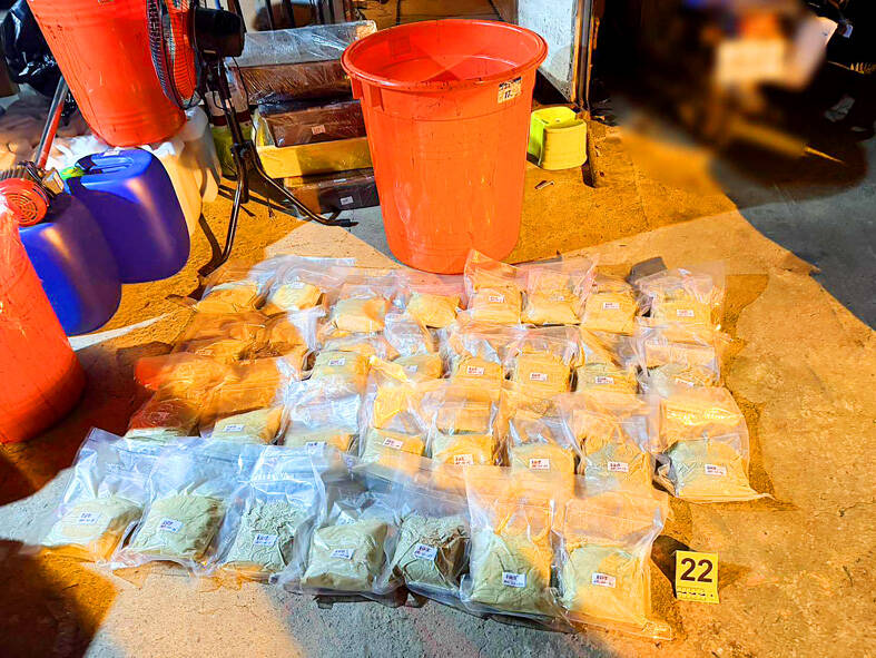 The Kaohsiung City Police Department’s Renwu Precinct yesterday said the factory, in a hilly area of Dashu District (大樹), was producing the Category 3 narcotic known as “meow meow.”