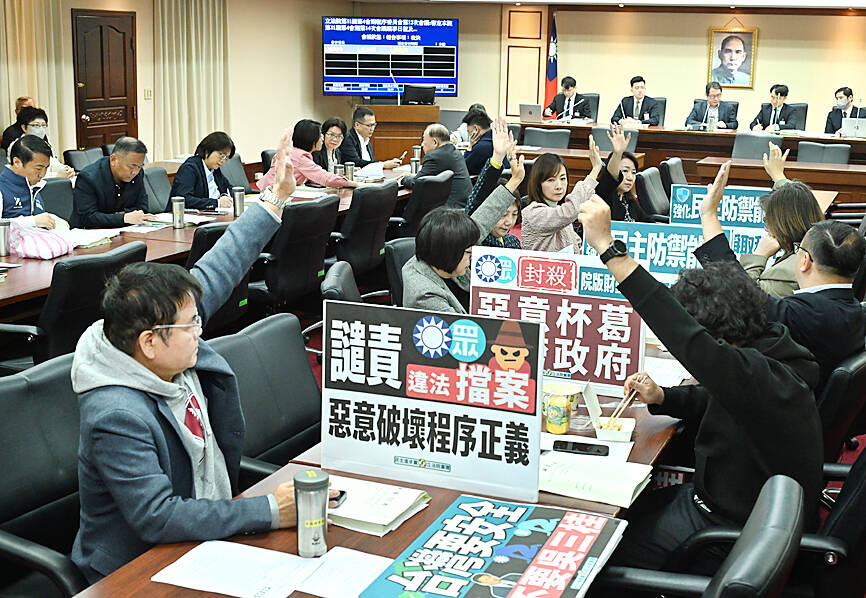 The opposition parties yesterday again blocked the Cabinet’s version of the Act Governing the Allocation of Government Revenues and Expenditures (財政收支劃分法) and the NT$1.25 trillion (US$39.7 billion) special defense budget during a meeting of the Legislative Yuan’s Procedure Committee.