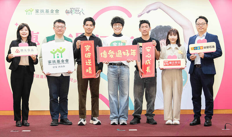 Singer-songwriter Crowd Lu, center, holds spring couplets along with event guests at a news conference hosted by the Taiwan Fund for Children and Families in Taipei yesterday. Lu, in his capacity as the foundation’s “Love Ambassador,” called for donations ahead of the new year.