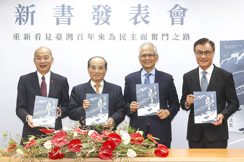 From left, Legislative Speaker Han Kuo-yu, and former legislative speakers Wang Jin-pyng, You Si-kun, and Su Jia-chyuan hold copies of You’s new book at a book launch event at the Legislative Yuan yesterday. The book collected works by 77 Chinese calligraphers and seeks to convey the spirit of a free and democratic Taiwan through calligraphy.