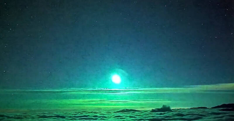 A green bolide streaks across the night sky over Yakou, a section of the Southern Cross-Island Highway in Taitung County, late on Tuesday night, briefly setting the clouds aglow. A bolide is an exceptionally bright meteor caused by a large meteoroid (usually more than 1m in diameter) entering Earth’s atmosphere, the Taitung County Transportation and Tourism Department said yesterday.