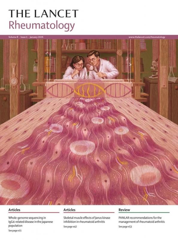 Cheng's cover for the January 2026 issue shows two scientists keeping a watchful eye over a loom weaving DNA, as immune cells and proteins gradually pile up in a metaphor for chronic inflammation progressing into organ scarring.
