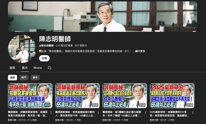 “Doctor Chen Chi-ming” (陳志明醫師) had posted several videos sharing health-related content, mainly healthcare tips for middle-aged and elderly people. The channel, which is no longer listed on YouTube, had more than 23,000 subscribers at one point, with one video receiving 150,000 views.