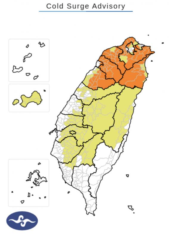 An "orange" cold advisory took effect for Taipei, New Taipei City, Keelung, Taoyuan, Hsinchu City and County, Miaoli County and Yilan County this morning and would remain in effect through tomorrow night amid a strong continental cold air mass, the CWA said.