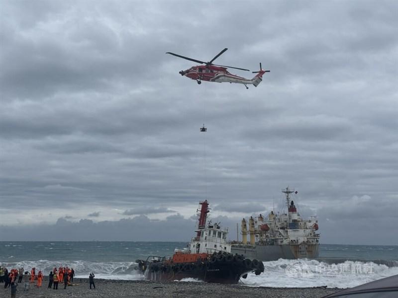 Local authorities said the Port of Hualien dispatched the tugboat to assist the bulk carrier that was waiting to dock and unload cargo at 9:30am when it suffered an engine failure, leaving it adrift and swept away by strong monsoon winds.