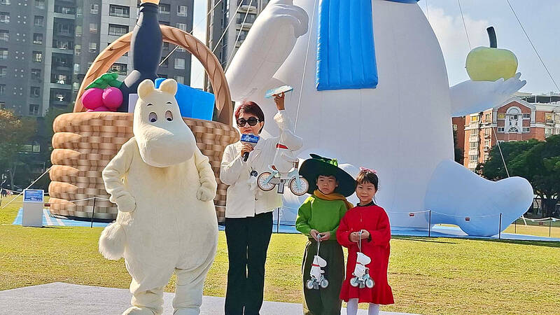 The Taichung City Government has chosen the Moomins to be featured in the main lantern of the Central Taiwan Lantern Festival, the city government announced yesterday. The city government yesterday displayed a 21m Moomin at Citizen Square, saying it would be on display until the festival. The main lantern area at Central Park would feature an immersive “Aurora Light Show,” created with Moomins as the theme, it said, adding that the lights would be on from Lunar New Year’s Eve on Feb. 15 until March 3. Taichung Mayor Lu Shiow-yen (盧秀燕) also revealed a small lantern featuring a Moomin riding a bicycle. The lantern fits the Year of the Horse, she said, referencing the literal meaning of the Hoklo (commonly known as Taiwanese) term for bicycle — thih-be (鐵馬, “iron horse”).