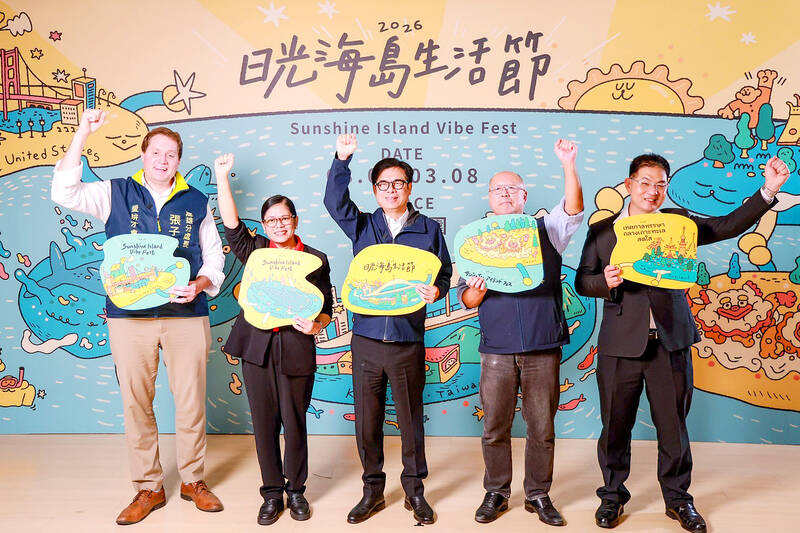 From left, American Institute in Taiwan Kaohsiung branch head Neil Gibson, Manila Economic and Cultural Office Kaohsiung Extension Office Representative Karina Bercasio Perida-Trayvilla, Kaohsiung Mayor Chen Chi-mai, Japan-Taiwan Exchange Association Kaohsiung Office Director Masafumi Oku and Thailand Trade and Economic Office Labor Division in Kaohsiung Director Nutchyawach Sanguanchaiyakrit pose for a photograph in Kaohsiung yesterday. They gathered to promote the Sunshine Island Vibe Fest, which runs from March 6 to March 8 in the city to deepen local connections with foreign cultures.
