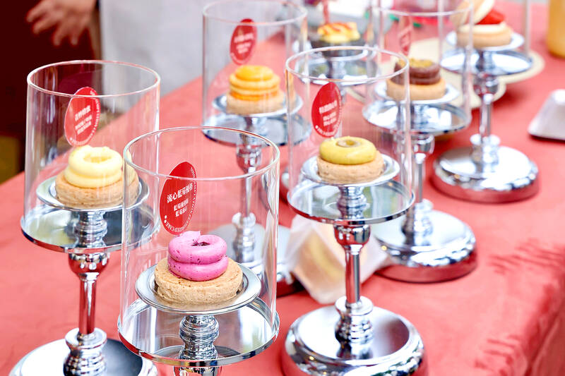 Decorative desserts are pictured at the Tainan Dessert Festival, held near the Tainan Public Library’s New Main Library yesterday. The festival is a two-day event that brings together hundreds of select dessert vendors and artisanal coffee, as well as crafters dedicated to cultural and creative handmade goods.