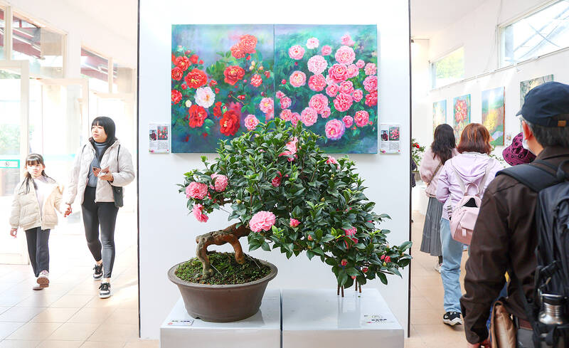 People visit the Taipei Camellia Show at the Floriculture Experiment Center in Taipei yesterday. This year’s camellia exhibition features camellia bonsai cultivated by the Camellia Society and the Taipei Parks Department, as well as meticulously shaped works by camellia experts. The Taiwan Camellia Breeding Society is also presenting newly developed varieties, while the Taiwan 3E Art Association showcases works of art themed around camellias. The exhibition is to run until Sunday.
