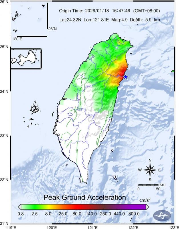 The earthquake occurred at 4:47pm, with its epicenter at sea about 45.4km south of Yilan County Hall at a depth of 5.9km, the CWA said.