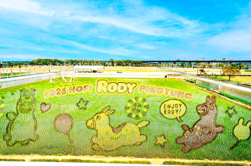 An undated photograph released by Pingtung County Commissioner Chou Chun-mi yesterday shows an image of Rody Horse in the county’s rice fields. Part of the 2026 Pingtung Tropical Agriculture Exhibition, the show is to run from Feb. 7 to March 1.