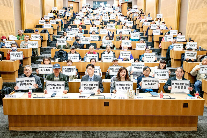 Representatives from a coalition of pro-localization groups during an event at National Taipei University of Technology yesterday hold up signs calling for the removal of authoritarian symbols from educational institutions. The signs read: “We have only our courage,” a quote from last year’s historical drama about the White Terror, “A Foggy Tale.”