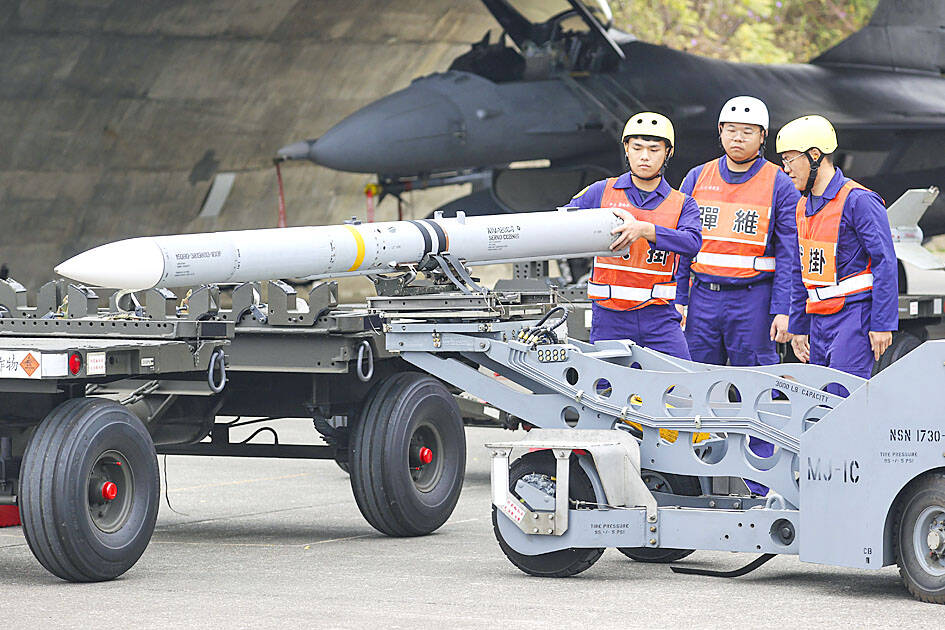 At Chiayi air base, personnel loaded US-made AIM-9M Sidewinder and AIM-120 AMRAAM anti-aircraft missiles onto a Lockheed Martin F-16V jet and got the aircraft quickly back into the air.