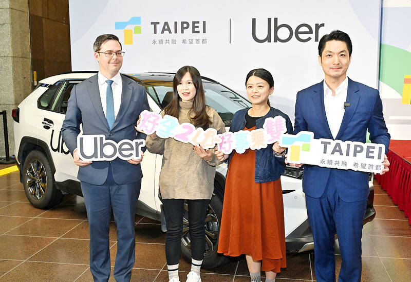 Taipei Mayor Chiang Wan-an, right, and Uber Public Policy and Government Relations for Asia-Pacific head Mike Orgill, left, pose for a photograph with two pregnant women at a news conference in Taipei yesterday. The Taipei City Government announced that it would subsidize discounted Uber rides for pregnant women.