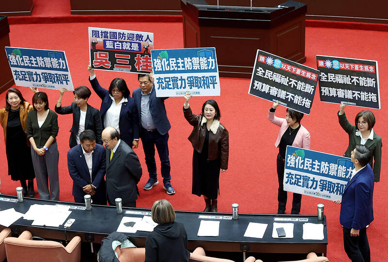The legislature has repeatedly blocked a review of the Cabinet’s special defense budget since President William Lai (賴清德) announced it in November last year, with the KMT and TPP demanding that Lai first brief lawmakers and take questions about the proposal — a request that the DPP has said is unconstitutional