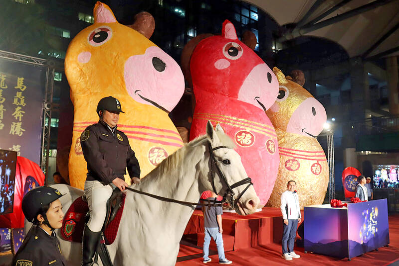 Three horse-themed sky lanterns to be released during this year’s New Taipei City Pingsi Sky Lantern Festival are unveiled at New Taipei City Civic Square yesterday. The display was accompanied by the New Taipei City Mounted Police Unit and their horses, symbolizing swift success, the New Taipei City Government said.