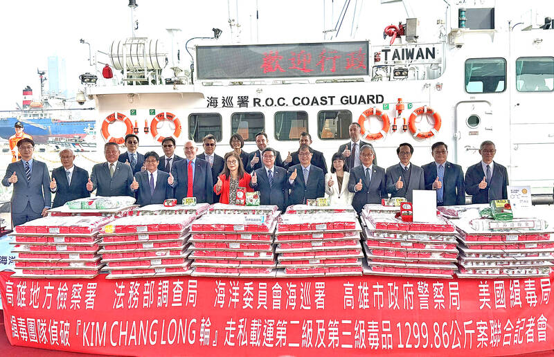 Premier Cho Jung-tai, seventh left, poses with members of the Coast Guard Administration, the Kaohsiung City Police Department, the Kaohsiung District Prosecutors’ Office, the Ministry of Justice Bureau of Investigation and the US Drug Enforcement Administration at a news conference in Kaohsiung yesterday showcasing the results of a drug bust by judicial authorities, acting on US intelligence, that intercepted a ship attempting to enter Taiwan with 1.3 tonnes of drugs.