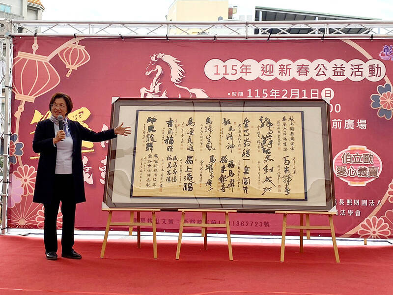 Changhua County Commissioner Wang Hui-mei gestures to a calligraphy work titled “Galloping Horses Set Out,” which was jointly inscribed by Wang and 15 renowned calligraphers, during a charity auction at the plaza in front of the Changhua County Art Museum yesterday. The work was sold at NT$268,000, but after Wang misstated the figure in an interview by adding an extra NT$20,000, the final price was adjusted to NT$288,000.