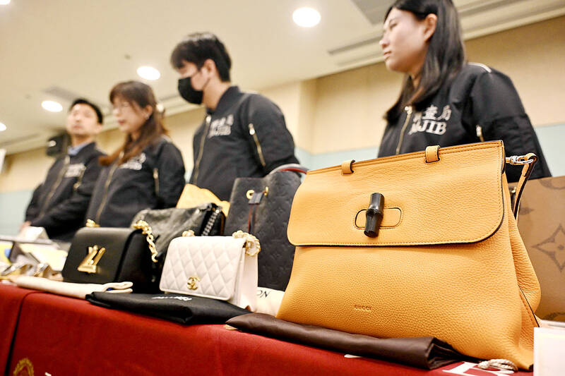 Ministry of Justice Investigation Bureau officers stand in front of seized items — including luxury watches, designer handbags, bank accounts and crime-related tools — at a news conference in Taipei yesterday. The bureau announced the results of its “Financial Anti-Gang Crime Task Force,” which uncovered 953 dummy bank accounts and seized more than NT$100 million (US$3.17 million) in illicit proceeds.