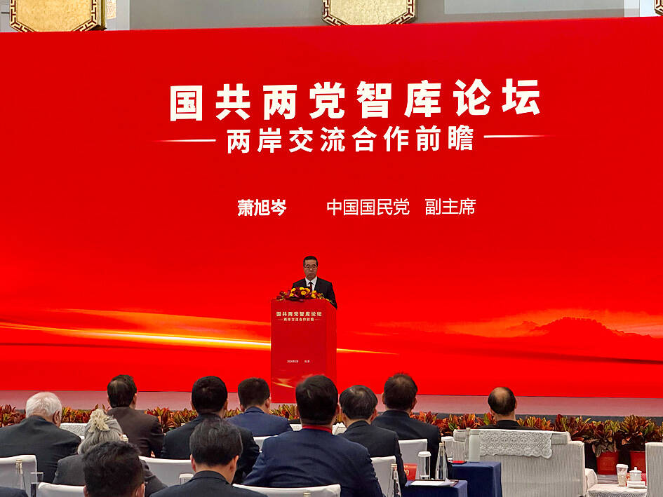 Chinese Nationalist Party (KMT) Deputy Chairman Hsiao Hsu-tsen (蕭旭岑) and China’s Taiwan Affairs Office Director Song Tao (宋濤) both spoke about upholding the so-called “1992 consensus,” opposing Taiwanese independence and “rejuvenating the Chinese nation” as pillars of cross-strait relations at a KMT-Chinese Communist Party (CPP) forum in Beijing yesterday.