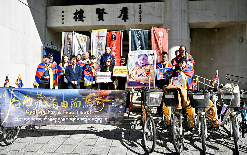 Members of Human Rights Network for Tibet and Taiwan hold placards at a news conference in front of the Legislative Yuan in Taipei yesterday. They launched the annual “Cycling for a Free Tibet” campaign, and announced that similar cycling events are to be held in Taipei on Wednesday next week, Feb. 25 and March 4, and in Kaohsiung on March 1.