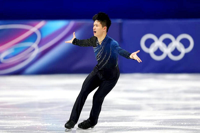 Taiwan’s Li Yu-hsiang performs in the men’s singles figure skating short program at the Milano-Cortina Winter Olympics, in Milan, Italy, on Tuesday. Li finished 24th with a score of 72.41 to advance to Saturday’s free skate portion of the event. He is the first Taiwanese to qualify for the free skate of men’s singles figure skating at the Olympics since David Liu in 1992.
