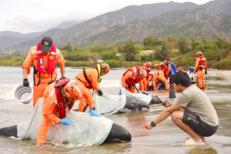 Wang Hao-ven (王浩文), who heads National Cheng Kung University’s Marine Biology and Cetacean Research Center, told reporters that the team was yet to determine why the animals beached and was hesitant to rush to conclusions.