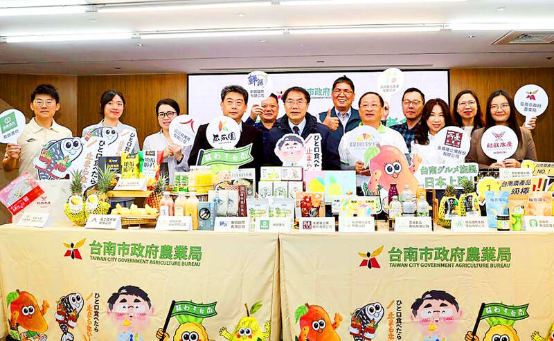 Tainan Mayor Huang Wei-che, front, fourth right, poses for a photo with manufacturers and dealers of agricultural products at a news conference in Tainan yesterday. Huang announced that he would lead a delegation to attend FOODEX JAPAN 2026, Asia’s largest international food and beverage trade show, to be held from Tuesday to Friday next week at Tokyo Big Sight in Japan.
