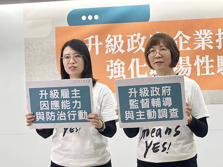 About 96 percent of the respondents said that companies should focus on preventing sexual harassment, foundation employee Huang Chuan-hsin (黃傳馨) said.