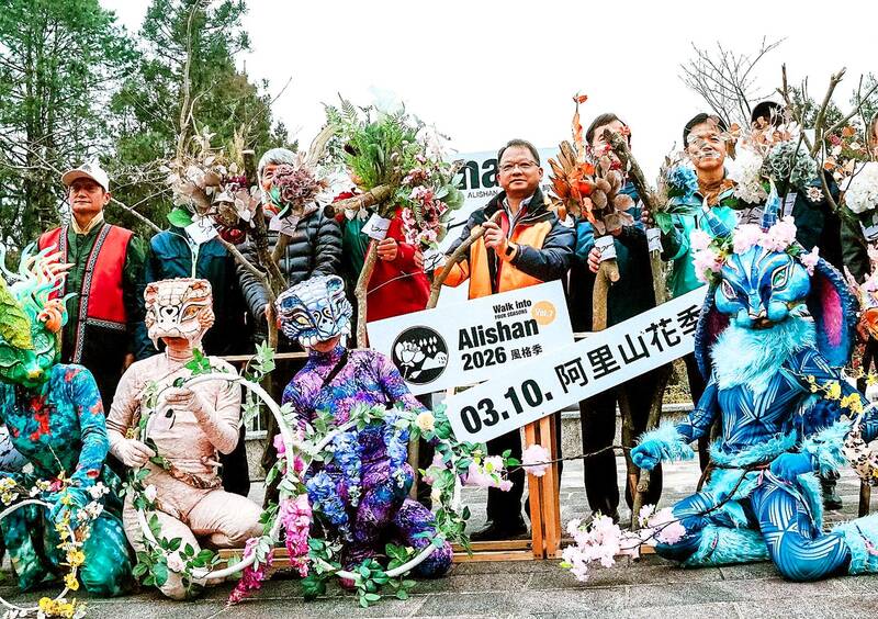 Forestry and Nature Conservation Agency Chiayi Branch Director-General Lee Ting-chung, third right, second row, poses with event guests and performers at Alishan National Forest Recreation Area yesterday to promote the Alishan Cherry Blossom season, which started yesterday and runs through April 10.