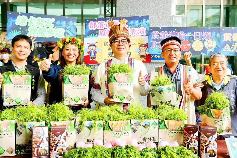 Kaohsiung Mayor Chen Chi-mai, center, poses at a news conference in Kaohsiung yesterday, to promote Namasiya District’s fireflies and peaches festival. The festival celebrating indigenous culture and locally grown fruit is to take place from March 20 through April 30.